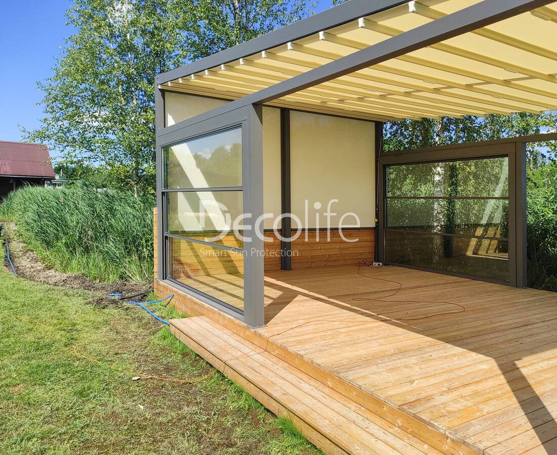 Пергола Decolife B600 PIR + Панорамное остекление S500, реализовано партнером "ООО Люкс Террас" - г. Москва
